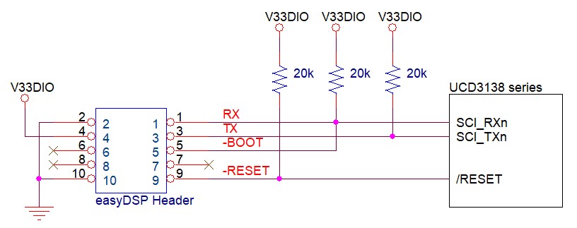 In case you don't use easyDSP provided bootloader for flash programming, no need to connect -BOOT and -RESET pins.