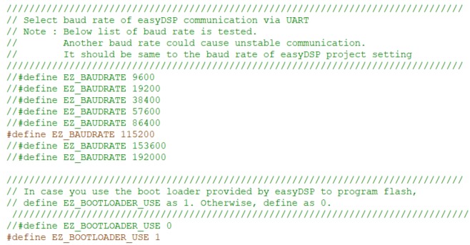 Please set the conditions of easyUCD.h. Below example shows you use UCD3138, UART0 with RX pin# 23 and TX pin# 22 at the baudrate 115200 and easyDSP provided bootloader for flash programming. Note that the baudrate shoud be same to one in the easyDSP project setting.