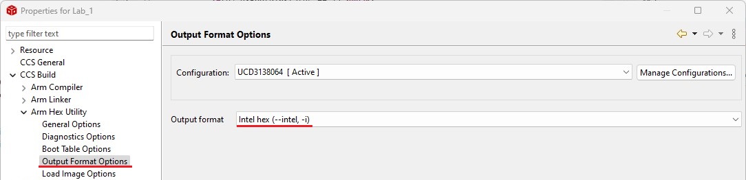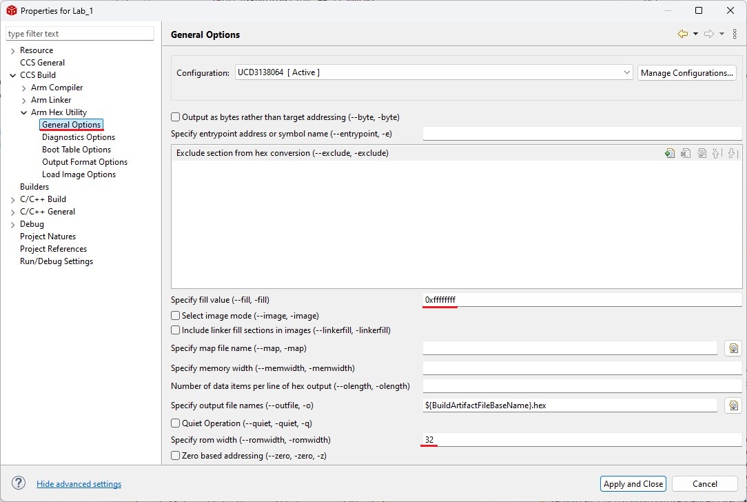 2. Set up your IDE to generate an Intel-format hex file with the same name as the output file in the same folder after each compilation. The hex file is used for flash programming. For example, in CCS, refer to the following settings: set the fill value to 0xFFFFFFFF, ROM width to 32, and Intel hex format.