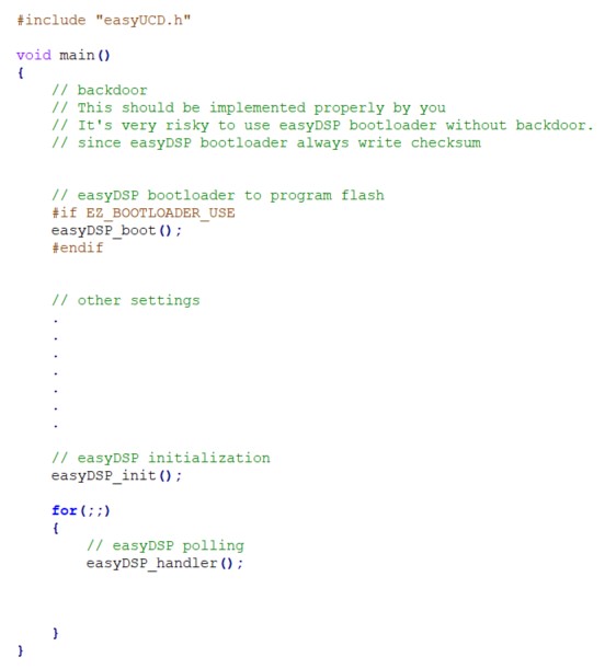 Then please include easyUCD.h in the file main.c. In the very beginning of main(), you have to implement a backdoor. It is mandatory for UCD3138 series especially with easyDSP. Please check TI's manual on how to implement the backdoor. Right after the backdoor, please call easyDSP_boot() in case you uses easyDSP provided bootloader for flash programming. Then call easyDSP_init() after some initialization codes. Last but not least, call easyDSP_handler() in the infinite loop. If there are many tasks in the infinte loop, call easyDSP_handler() multiple times so that easyDSP can secure time slot for its communication to MCU.