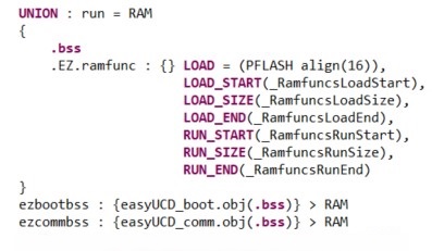 3. To program and erase a flash, this bootloader should reside in RAM area. So, to copy the bootloader code in flash to RAM, and to minimize the additional RAM size for this, some modification should be done in a linker command file. Please check below : To minimize the required RAM size, by using UNION, .bss and .EZ.ramfunc region are overlapped in RAM. In addtion, .bss section of two files are separately allocated to RAM.