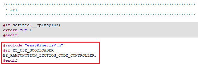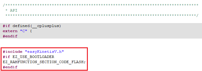 프로젝트내 drivers 폴더의 fsl_ftfx_flash.h , fsl_ftfx_controller.h 파일이 대상입니다. 각 파일 중간부분에서 API 함수를 선언하기 직전에 아래 빨간색 상자처럼 코딩을 추가합니다.