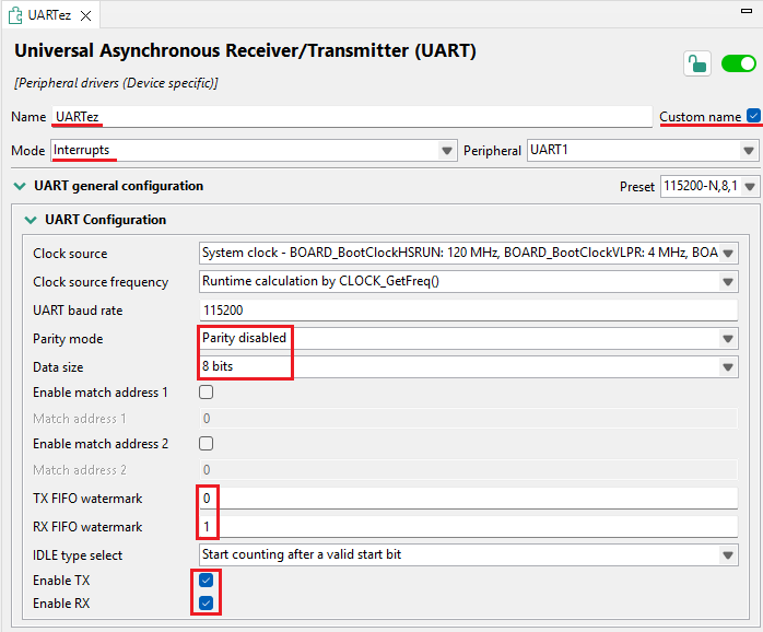 적절한 클럭 설정도 필요합니다. 필요시 ConfigTools>Clocks 메뉴에서 해당 UART의 클럭을 활성화 및 설정해주세요.