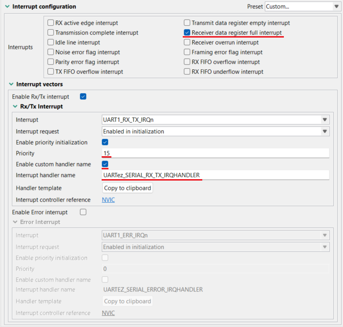 인터럽트 핸들러 이름은 UARTez_SERIAL_RX_TX_IRQHANDLER으로 설정합니다.