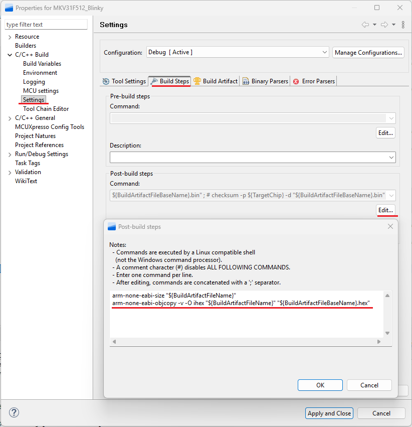 예를 들어 MCUXpresso IDE 사용시 Post-build steps에 헥스파일 생성을 지정할 수 있습니다.
