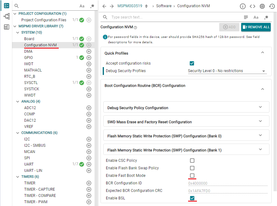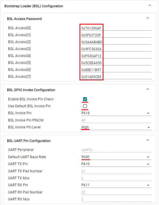 BSL UART Pin을 설정하실 수 있습니다. MSPM0는 UART0을 BSL_RX, BSL_TX로 사용하며, MSPM33은 UC12를 BSL_RX, BSL_TX로 사용합니다.