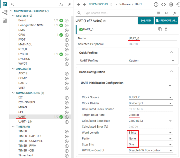 상기 STEP2와 같이 MSPM0의 경우 UART0, MSPM33의 경우 UC12를 UART 채널로 선택합니다.![]()