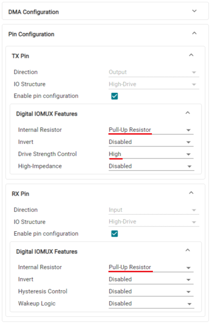 TX/RX 핀의 풀업 저항을 활성화시키며, TX핀의 Drive Strength Control은 가능하다면 High로 설정합니다.