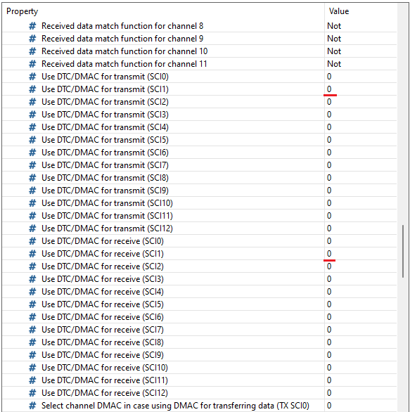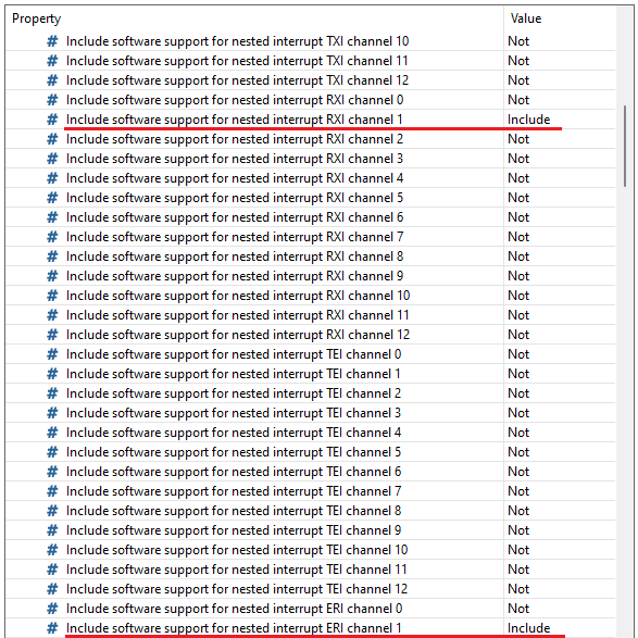 easyDSP는 SCI 채널 1을 사용하므로, r_sci_rx 컴포넌트에서 관련 설정이 필요합니다. 아래 그림 빨간색 부분을 참조하세요. easyDSP 용도로는 circular 버퍼를 사용할 필요가 없습니다만 만약 다른 용도로 사용하게 된다면, 추후 r_byteq 설정에서 적절한 주의가 필요합니다. 채널 1의 TXI, RXI, ERI 인터럽트가 네스팅될 수 있게 설정합니다.