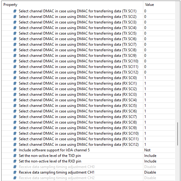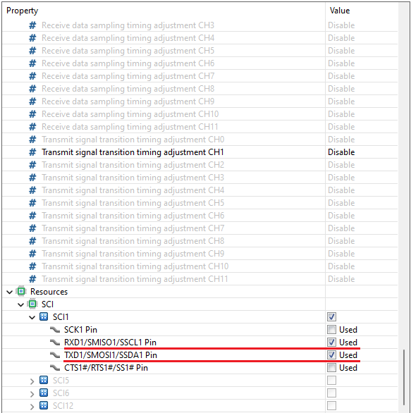 SCI1의 RXD1, TXD1 핀을 활성화시킵니다. 다른 SCI1 핀은 사용하지 않습니다.